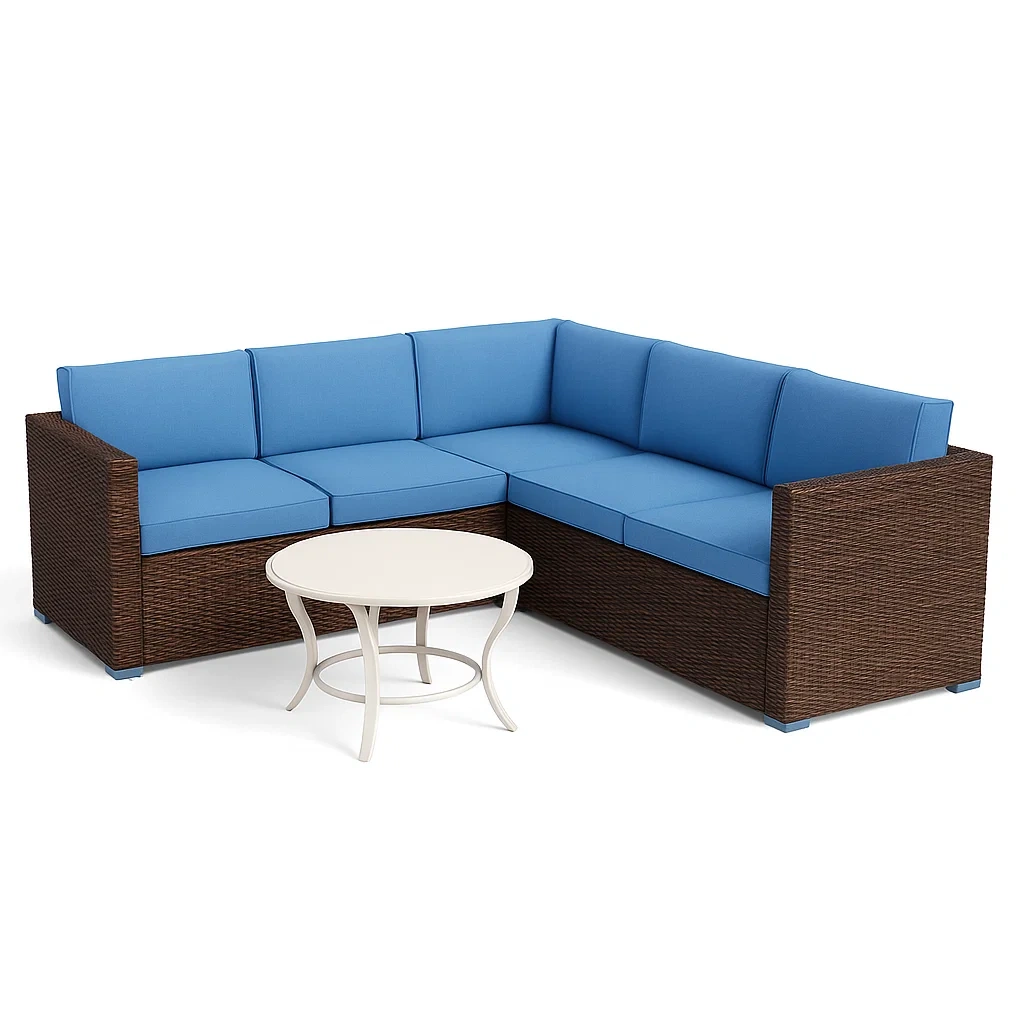 Ensemble de salon Ensemble de Canapé d'Angle en Résine Tressée avec Coussins Bleus et Table Ronde en Aluminium
