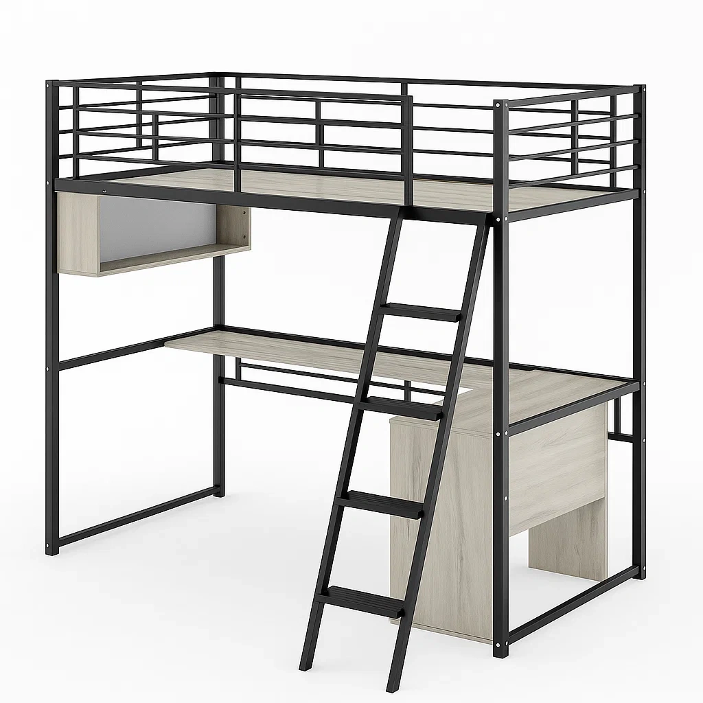 Lit mezzanine Lit Mezzanine en Métal Noir et Bois Clair avec Bureau Intégré